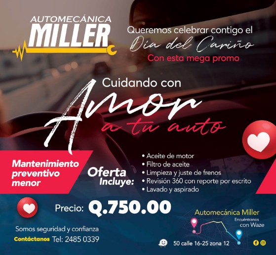 SlidePromocionesAprovecha las promociones que Automecánica Miller tiene para ti… SlidePromocionesAprovecha las promociones que Automecánica Miller tiene para ti… Nuestras promociones del mes Descubre nuestras promociones especiales en Automecánica Miller. Ofertas exclusivas para cuidar tu vehículo al mejor precio.